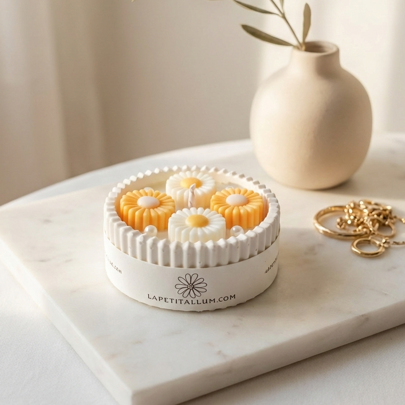 La superficie está decorada con pequeñas margaritas de cera, moldeadas una a una, que aportan un toque romántico y natural. Cada detalle convierte esta vela en una pieza especial, pensada no solo para perfumar, sino también para decorar.