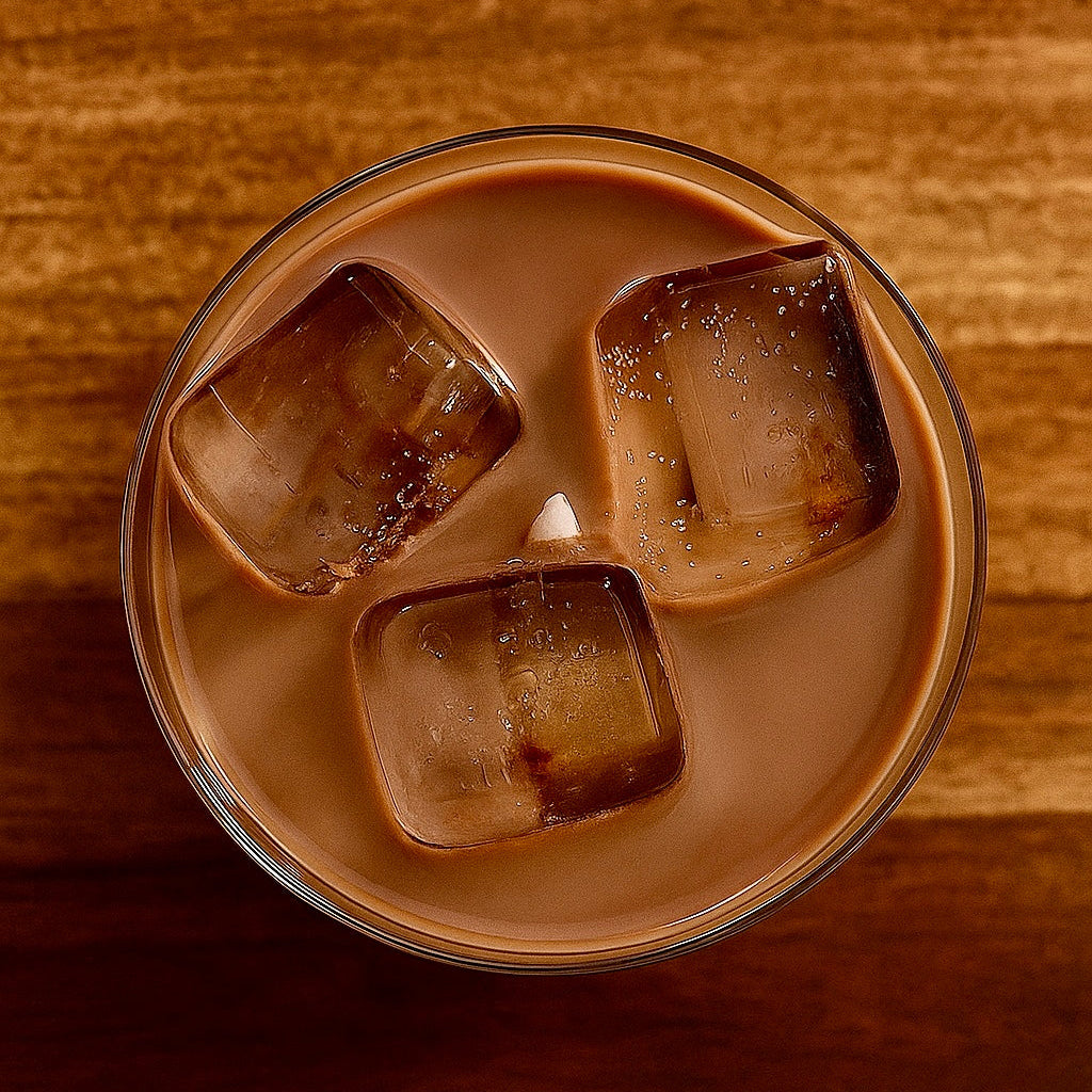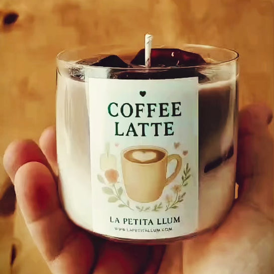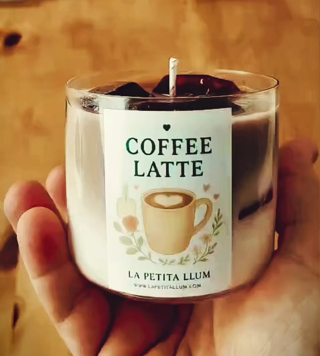 Elaborada en vaso (reutilizable una vez acabada la velita), con cera de soja y cubitos de gel para velas (parafina) que simulan hielo, aportando un toque original, visual y refrescante, su diseño bicolor evoca un auténtico "coffeé latte": base cremosa y capa superior de tono espresso.