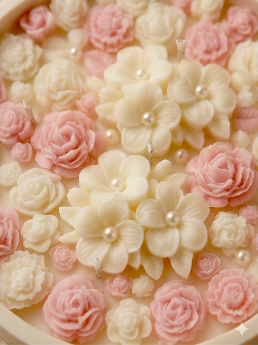 La superficie está decorada a mano con flores de cera de soja en tonos blanco y rosa suave, creando un efecto romántico y muy especial. Cada vela es única, ya que las flores se colocan manualmente una a una.